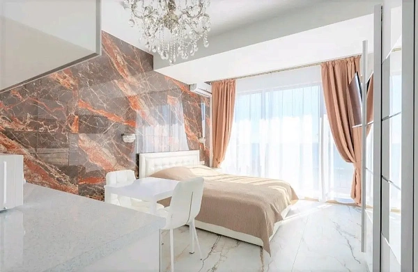 Апартаменты с новым дизайнерским ремонтам в центре Сочи, общая площадь 38м2, просторная кухонная зона совмещенная со спальной зоной, новая мебель и техника именитых брендов, элементы декора, теплый пол, панорамное остекление, кондиционер, центральные коммуникации.