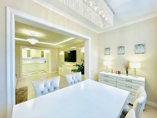 Общая площадь квартиры составляет 85м2, из них: просторный зал с зоной тв и лоджией, кухня, две изолированные спальные комнаты с большой двухспальной кроватью, два санузла с ванной и душевой, коридор с большой гардеробной.