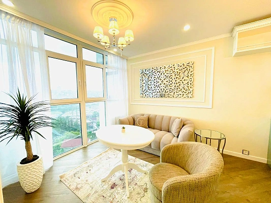 Вместительная кухня гостинная. Отдельная спальная комната. Вся квартира обставлена итальянской мебелью. Дизайнерский ремонт. Витражное остекление. Вид на море.