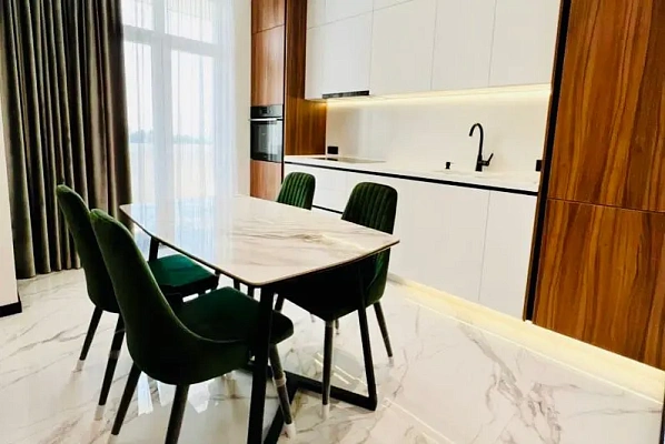 Совершенно новый ремонт сделанный в светлых тонах. Мебель и техника топовых брендов. С панорамных окон и балкона открывается прекрасный завораживающий вид на город и море. Площадь квартиры составляет 70м2, две отдельные светлые комнаты и просторная кухня гостиная, в квартире ещё никто не жил,