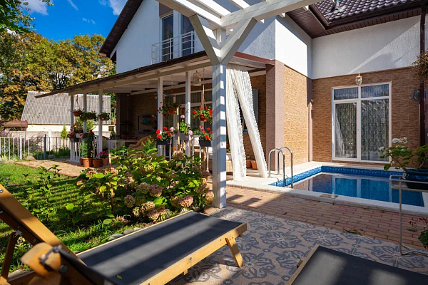 На территории имеются закрытая терраса , обустроенная цветочная зона отдыха у бассейна, детский городок,гараж