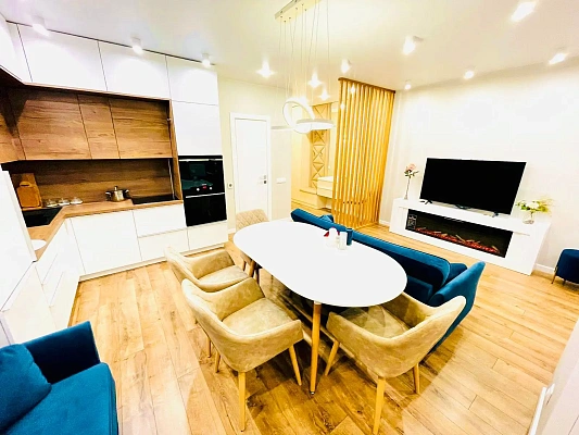 Большая отдельная спальная комната, просторная кухня гостинная, новая итальянская мебель и качественная немецкая техника. Панорамные окна. В квартире сделан качественный дизайнерский ремонт. Высокий этаж позволит любоваться видом на горы и город.