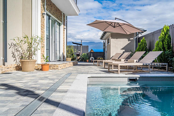 Во дворе дома есть тёплый бассейн, шезлонги, зона барбекю, батут, и зона отдыха.