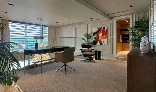 Ремонт сделан в современном стиле из премиальных материалов. Также пентхаус имеет свою террасу с собственным бассейном и лаундж зоной.
