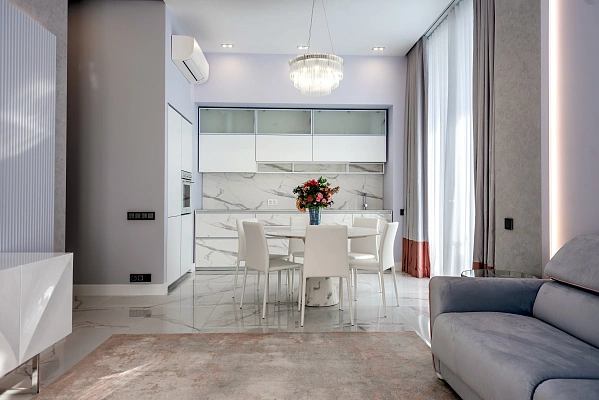 Просторная гостевая комната, совмещенная с кухней и столовой зоной.