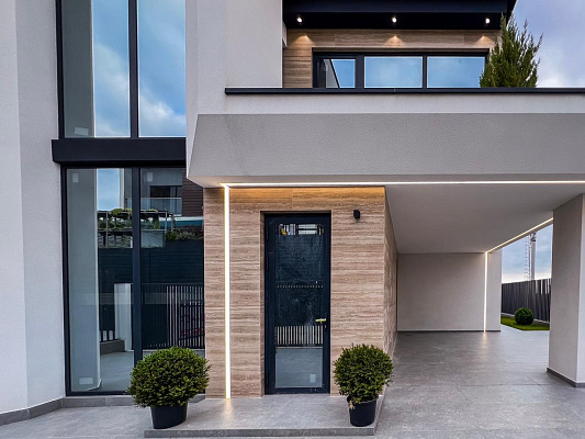 Архитектура дома выполнена в самом востребованном стиле – хай-тек. Минимализм, четкая геометрия, простота форм создают гармонию. Окружающее пространство не перегружается дополнительными элементами. Натуральные природные оттенки цвета в сочетании с применением современных технологий, материалов создают колорит стиля хай-тек. Фундамент выполнен на сваях, все работы ведутся профессиональной строительной компанией с соблюдением всех норм строительства и геодезии. Отделка фасада комбинированная – декоративная штукатурка, элементы и керамогранит. Ограждение балконов и эксплуатируемой кровли – стекло триплекс. Благодаря панорамному алюминиевому остеклению дома наполнены большим количеством естественного света. Инженерия посёлка отвечает всем современным требованиям, все коммуникации центральные, проложены под землей.