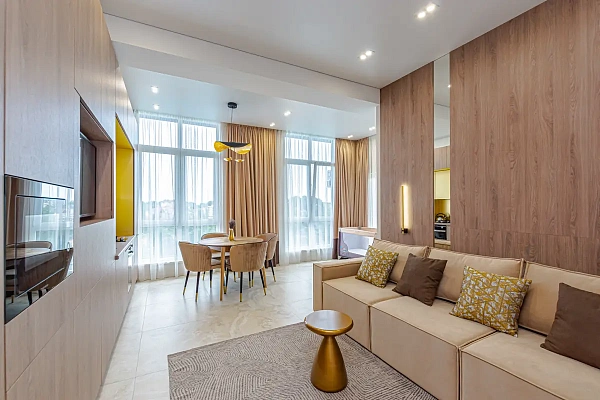 Ванная комната выполнена из материалов премиум-класса, придавая ей роскошный вид. Особое внимание уделено фирменному освещению, создавая атмосферу уюта и комфорта.