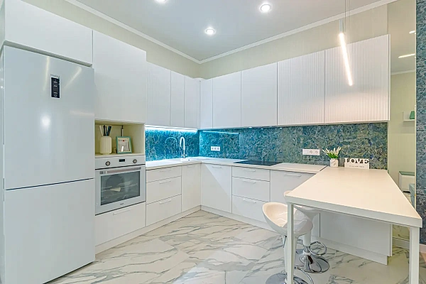 В квартире выполнен современны светлый дизайнерский ремонт из качественных материалов. Есть две изолированные спальни, а так же очень просторная кухня-гостиная в которой установлена барная стойка и большой обеденный стол. Для комфортного проживания в квартире большой семьёй есть две ванные комнаты.