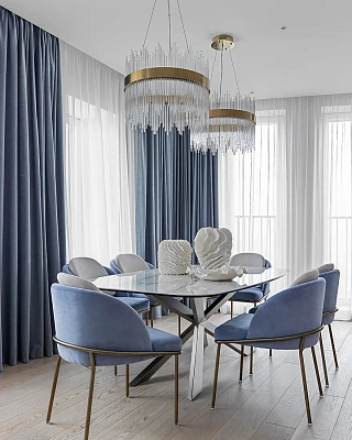 Пространство кухни в отделке металлическим листом. Эффектная вытяжка в золотистом оттенке. Колонны и нижние шкафчики отделаны шпоном, а столешница и фартук — искусственным камнем под мрамор. Также дополнением к системе хранения служат открытые полки из латуни со встроенной подсветкой.