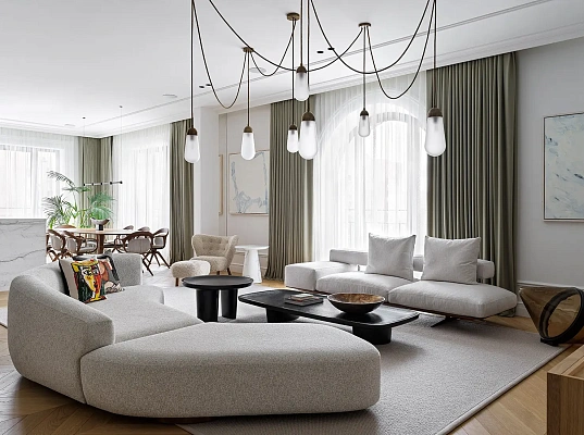 Палитра интерьера мягкая, оживленная оливковым тоном портьер в гостиной, активными темными элементами и цветными акцентами. Каждый предмет мебели подобран так, чтобы сочетаться с соседствующими. Вся мебель, кухня, свет и аксессуары были приобретены через Вuhаnоv Grоuр.