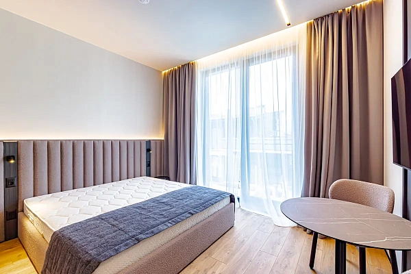 В номере выполнен дизайнерский ремонт, с использованием дорогостоящих и высококачественных материалов. Мебель, техника немецких и швейцарских производителей, всё это остается будущему владельцу, включая 3 комплекта постельного белья.