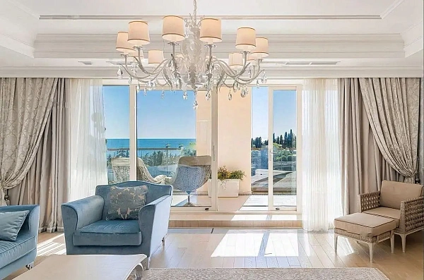 В апартаментах сделан ремонт в классическом стиле. С балкона открывается вид на морскую гладь. Планировка правильная и грамотно спланирована.