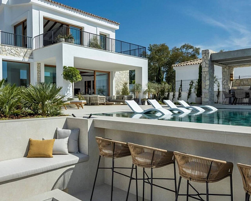 На территории есть бассейн, мангальная зона, зона отдыха и летняя кухня. Ремонт делали для себя из премиальных, качественных материалов. Есть большая терраса с шикарным видом на море, где можно расположить столик и стулья для семейного обеда или ужина.