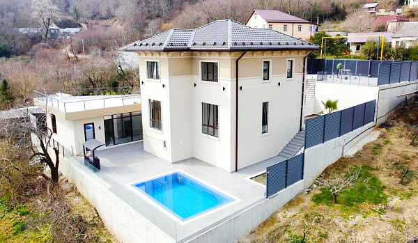 На участке площадью 6 соток выполнен ландшафтный дизайн, подчеркивающий красоту архитектурного решения самого дома. Тут высажены кусты субтропических растений. Также на территории находится баня, открытый бассейн, зона барбекю, парковка на несколько автомобилей, а так же просторная терраса, на которой по Вашему желанию можно организовать дополнительные зоны отдыха, разбить зимний сад или же просто находясь на ней любоваться красотами курортного города.
