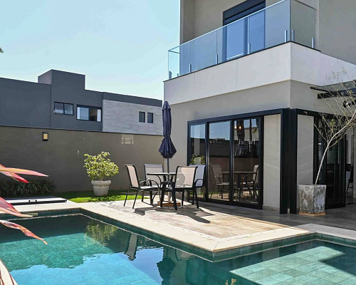 На территории самого дома есть большой бассейн с зоной отдыха, небольшая площадка для йоги, зона барбекю и летняя кухня.