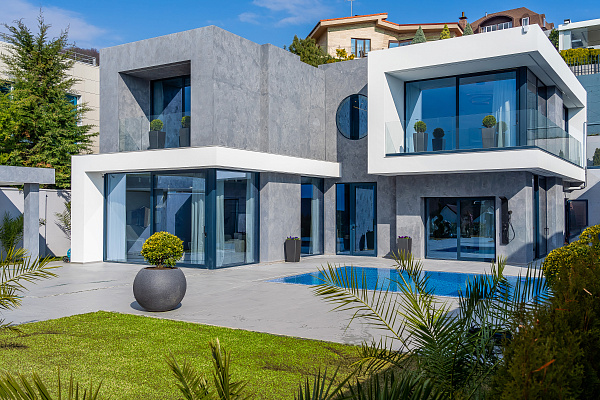 На территории расположена беседка, и имеется место для спорт.зала с видом на море. В отделке использованы премиальные марки : Shuko- раздвижные системы алюминиевого профиля, приточно-вентиляционная система. По всему дому сделаны теплые полы, кроме спален - установлены конвектора, установлена музыка для фона, система видеонаблюдения, интернет. Планировка представляет собой 4 спальни и 6 сан/узлов. 1 этаж: Хол, Кухня-гостиная с выходом на террасу к бассейну, мастер-спальня с собственным сан/узлом и гардеробной, может быть использована как кабинет, гостевой сан/узел, постирочная и гардеробная. 2 этаж: 3 мастер спальни с собственными сан/узлами и гардеробными и выходом на балкон. 3 этаж: эксплуатируемая кровля, может быть использована, как зимний сад, или зона отдыха.