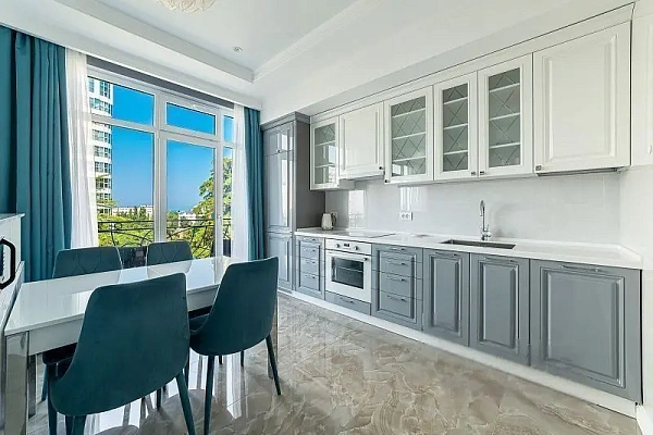 В квартире выполнен новый дизайнерский ремонт, никто не жил. С окон открываются шикарные виды на зелень и море.