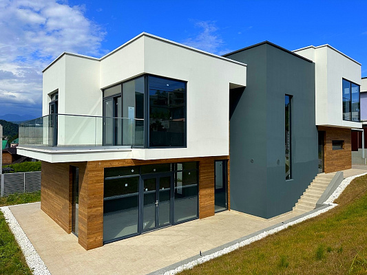 Коттедж площадью 250 кв.м., премиум-класса, расположен в предгорье, в стороне от городской суеты, имеет свою атмосферу надёжности, спокойствия и единения с природой. Фасад дома выполнен с использованием широкоформатного керамогранита Kerama Marazzi (премиальная серия Wood), импортной краски Tikkurilla и Profitec. Особенность сочетания материалов и фактур подчеркивает отсутствие борта при переходе от плитки к артбетону. Подключена автоматическая подсветка выхода на балкон. Земельный участок 5 соток, на территории дома выполнен ландшафтный дизайн, установлен автополив растений и газонов. Раздвижные панорамные окна с мультистеклопакетом, алюминиевым профилем Alutech и с защитой от ультрафиолета обеспечивают энергоэффективность и тишину. Установлены немецкие стеклопакеты Titan, уникальная по своему видам и свойствам - немецкая фурнитура. Дизайнерская входная дверь оснащена биометрическим замком. Проект застройки завоевал 1 место в конкурсе Сочинской городской организации Союза Архитекторов России!