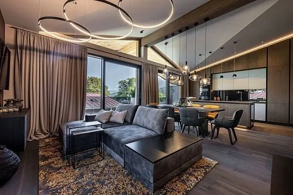 Благодаря большим витражным окнам из апартаментов открывается потрясающий вид на горы.