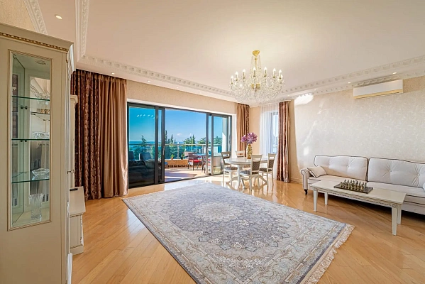 Квартира с большой площадью, в ней две просторных спальни для владельцев жилья и их гостей; уютная и удобная кухня; два сан узла, гардеробная комната, два больших балкона для отдыха с видом на море.