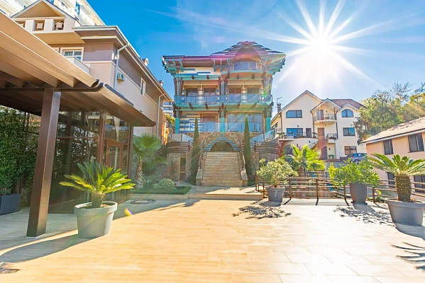 Продается просторный, светлый, уютный дом в г. Сочи. В доме 5 спален, большая кухня-гостиная, бассейн, баня, паркинг на 5 машин, сад, домик для гостей. Прекрасный вид на море.
