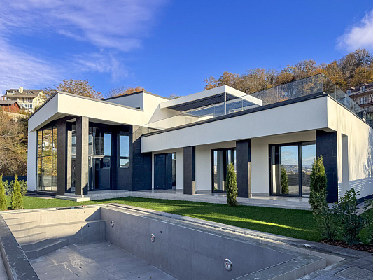 Стильный дом вашей мечты с просторной террасой с видом на город. Высота потолков 5 метров ,кухня-гостиная ,три спальни и мастер спальня на 2 уровне.На улице ландшафтный дизайн - газон ,туи и вечно зеленые растения