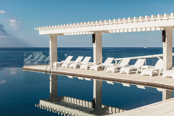 Собственный пляж, оснащённый шезлонгами и мягкими креслами, что создаёт идеальные условия для комфортного отдыха.