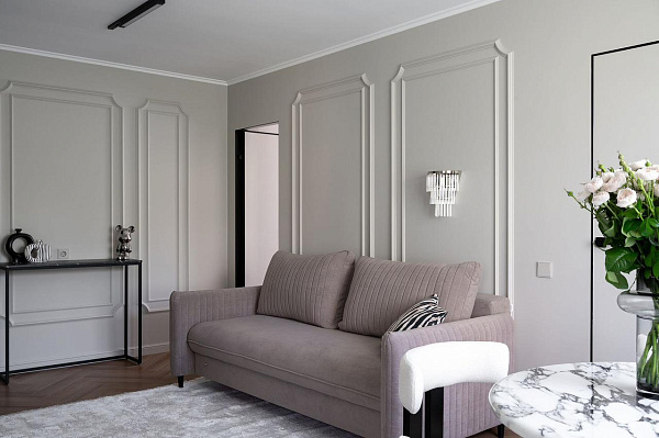 * Современная неоклассика в отделке: кварц-паркет, штукатурка потолка