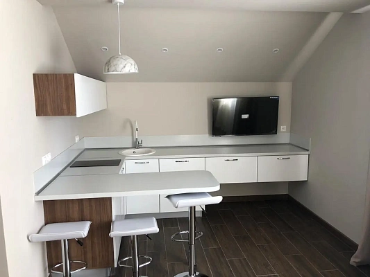 Выполнен качественный ремонт, установлена мебель - шкаф купе, кровать с матрацем, кухонный гарнитур, барная стойка, стулья, оборудованная прихожая, так же имеются - электроплита, кондиционер, телевизор и холодильник, установлены светильники, полностью оборудованный санузел.
