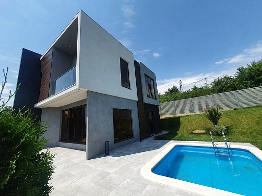 Продам дом в стиле Hi-Tech с панорамным видом на горы, море и олимпийские объекты: 2 этажа общей площадью 165 м2; Эксплуатируемая крыша 94 м2; Дом оформлен, имеется адрес; Монолит с 9 сваями; Предчистовая отделка. Фасад дома выполнен с использованием широкоформатного керамогранита, арт-бетона и планкена из лиственницы. Панорамные окна с мультистеклопакетом гарантируют энергоэффективность и тишину. В полном объёме выполнено архитектурное освещение дома. Система безопасности обеспечивается видеодомофоном и камерами по периметру участка с возможностью он-лайн доступа с любого мобильного устройства. Дизайнерская входная дверь оснащена биометрическим замком. Разработан ландшафтный дизайн и встроен автополив растений и газона. Бассейн на улице с функцией подогрева и системой фильтрации воды. Все необходимые коммуникации: свет 15кВт, газ, вода, ЛОС. ! Отдельный тупиковый заезд, шлагбаум, парковка на 2 автомобиля. Инфраструктура: 8 км или 12 мин на авто до моря, 5 мин до аэропорта, 30 мин до Красной Поляны. Остановка общественного транспорта 50 метров. Магазин 200 метров