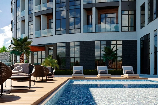 На придомовой территории расположилась просторная зона для отдыха и занятия спортом в виде круглогодичного, подогреваемого бассейна открытого типа, площадью 60 кв.м. с зонами для отдыха, шезлонгами, зонтиками, зоной барбекю, детской и спортивной площадками. По периметру жилого комплекса наземная, свободная парковка, на которой могут размещать автомобили все жители комплекса. Также построен подземный паркинг на 18 машиномест. Территория благоустроена ландшафтным дизайном и дополнена декоративными растениями, цветами и туями, которые способны оживить жильцов в любое время года и наполнить воздух особым, целебным ароматом.