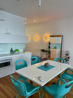 85м2, распланированы в спальню и кухню-гостиную. Выполнен дизайнерский ремонт, мебель и техника остается. Витражное остекление, высокие потолки.