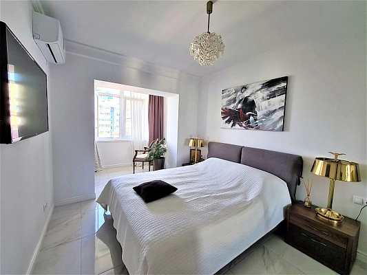 Площадь 60м2. Планировка квартиры: кухня, спальная комната с кабинетом, гостиная с жилой лоджией, гардеробная зона и совмещенный с/у. Выполнен дизайнерский ремонт, установлена новая мебель и техника.