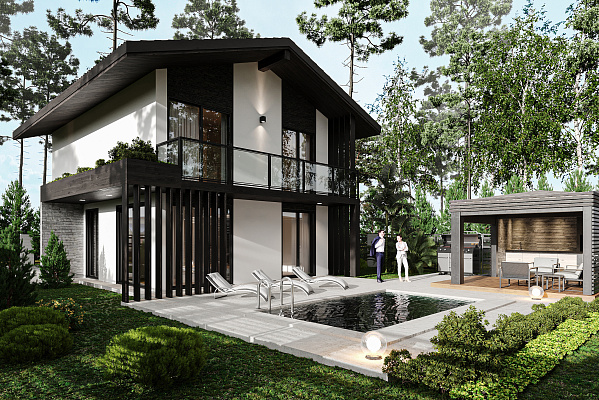 Фасад выполнен из дорогостоящей фасадной штукатурки , элементов дерева и керамогранита.