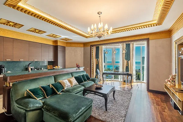 Квартира с новым дизайнерским ремонтом. Площадь 92 кв. метра. Планировка (спальня, зал, кухня, гардеробная). Новый ремонт из премиальных материалов. Мебель и техника. Панорамное остекление. Высокие потолки. Вид из окон на море. Есть балкон с зоной отдыха.