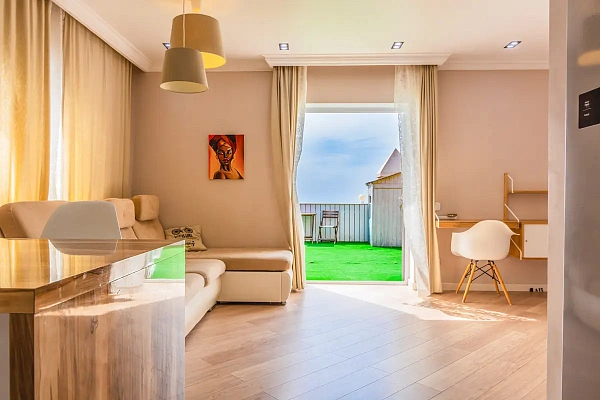 Квартира распланирована в 2 спальни и просторную кухню гостиную, с выходом на большую террасу с прямым видом на море! Также с кухни гостиной есть выход на отдельную собственную зону барбекю. (площадь каждой из террас 30м2, одну из них возможно сделать еще одной полноценной жилой комнатой)
