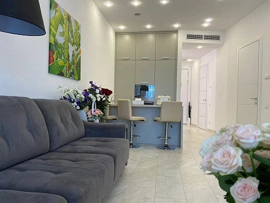 Дизайнерский, дорогой ремонт и техника премиального качества.