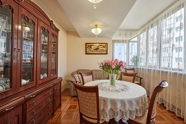 Продам квартиру площадью 100 м2, распланирована в две изолированные спальные комнаты, зал, кухню-гостиную, гардеробную. Квартира светлая, с видом на море.